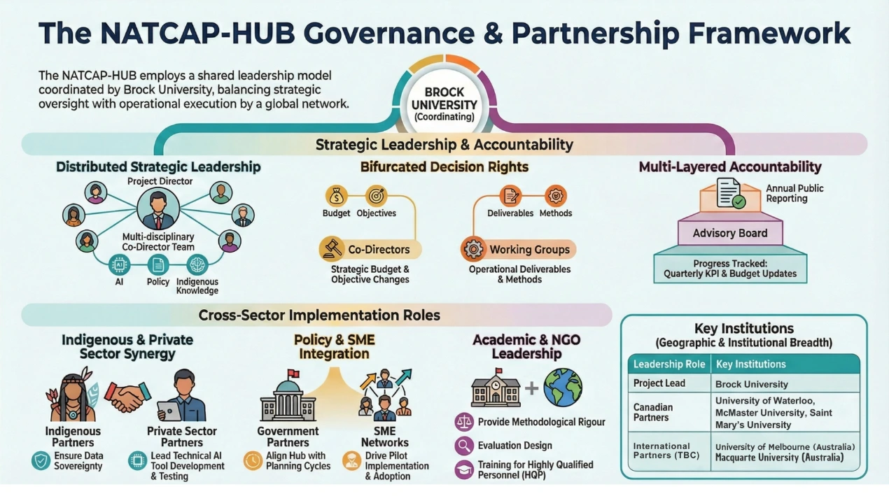 NATCAP-HUB’s governance and partnership framework, highlights its distributed leadership model (coordinated by Brock University), bifurcated decision-making, multi-layered accountability, and cross-sector implementation roles to ensure inclusive, transparent, and effective delivery of project objectives. This framework is designed based on three governance pillars: transparency, shared leadership, and accountability.